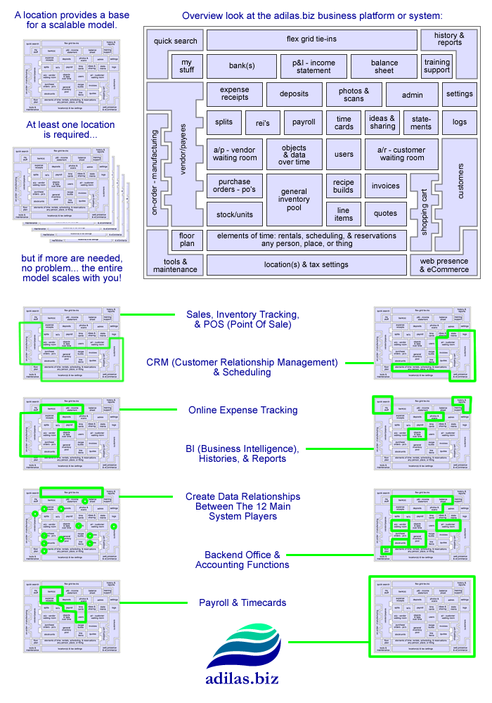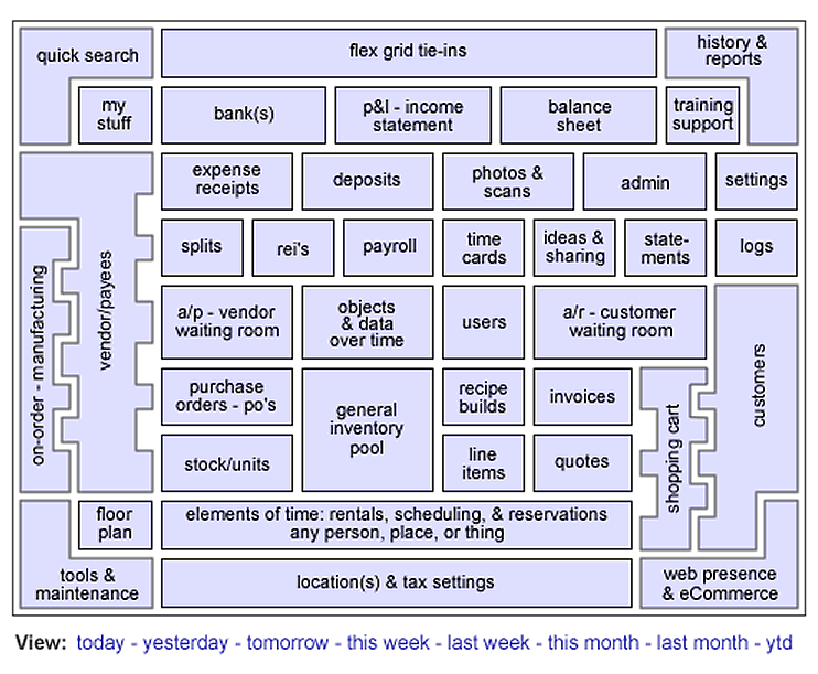 Because the temporary graphic can't show or talk to you yet, we have added a few key point here to help show some of the planning that went in to the interactive map: 1. To start with, each corner piece of the map has been hand selected. These four primary positions contain some of the most diverse elements that we felt were critical to the success of the web application. We have the quick search in the top left corner - which allows you to jump to any place in the system (more...). History and reports is in the top right corner - this is how you get at your data and see what is going on. Tools and maintenance is in the bottom left corner - the entire system deals with a huge toolset and being able to keep things going and flowing. The bottom right corner is web presence and eCommerce. The entire system is web based and deals with providing products and services to your customers. The eCommerce piece is fully functional. We have plans on expanding the eCommerce features to include: a customer bill pay portal, view invoices and quotes (system activity and history), and online reservations. 2. On the bottom of the map is a section for the locations and tax settings. This is shown as a single room (button) but in real life could be as many as are needed. Each item in the system is tied to a location. In a way, the entire model could be added to with multi locations. Think of floors or levels of a building. Each location could virtually become it own floor in this type of analogy. 3. Time or elements of time is another huge base concept for the Adilas system. If you think about it... the entire application is running objects & data over time. Almost every item or sub item has an element of time associated with it. This could be a general date, a due date, a bank date, an action date, etc. This physical section (second long button on the bottom) has been publicly released (round one) but still has a number of updates and functions still under construction (round two and three). More options will be coming soon. See this help file to get more information about elements of time. 4. Both sides have your incoming products and services and your outgoing products and services. On the left you have vendors, payees, on-order, and manufacturing. These are your incoming sources. On the right you have customers and a shopping cart interface. These are your outgoing products and services. The shopping cart interface is specifically very deep and flexible. In a way, almost all of the other pieces hinge on this "interface" between the customers and the rest of the system. For more information about that part of the puzzle, see this help file. 5. The section on the bottom middle is for inventory control and flow. This included purchase orders (PO's), stock/units, the general inventory pool (parts and services), recipe/builds, special line items, and flowing into invoices and quotes. The entire section shows which pieces flow across the system from coming in to going out. Depending on your business, the flow may change, but most likely it will be using these pieces. The inventory tracking is also tied to elements of time and locations and tax settings. The entire bottom section is the operations of the business and things change here from day-to-day. 6. The middle section deals with more time and concept pieces. You have a virtual waiting room for vendor/payees. This is your accounts payable (who you owe money to and how long they have been waiting to get paid). On the other side you have a customer waiting room which is your accounts receivable (who owes you money and how long you have been waiting for payment from them). These values end up becoming part of your companies financials. Both sections are fully automated all the way through the process. 7. In the very middle you have two main concepts. This is the heart and soul of the application. One is objects and data over time and the other is users. Objects and data over time is what the entire Adilas business platform is built on. We are physically building multi sided objects and running them over a life cycle or timeline. This is how we create a virtual road map of what is where and how long it has been there. This time based model also provides a virtual look-back as to where was I and where am I going or headed in the future. Imagine a physical road with tons of motorcycles, cars, trucks, SUV's, busses, trains, planes, UFO's, etc. all doing their thing. Each object is tracked over time and the system keeps track of where it is and where it is going. This becomes a concept we call roll call accounting. Basically, it is the story behind the numbers and what happens over time. The other part of this is the users. A user is the only piece greater than a corporation or business entity. The reason a user is greater than a corporation is because they (you and me) can actually play in multiple corporations or business entities. They are the movers, shakers, and players in the system. They move, do, use, and make the system work. 8. Moving up to the top middle portion of the map, you start getting into a number of accounting and management concepts. On the left you have banks, expense/receipts (money going out), splits (payments on account), rei's (reimbursements or money owed to others), and deposits (money coming in). This is your banking and money flow portion. Most times that you are paying out money, you will be using either vendors/payees or user/payees. This could also include payroll and timecards. The deposits (money coming in) comes from invoices, sales, invoice payments, and accounts receivable payments. You could also have investments or other in flowing monies that would need to be tracked in the company financials. 9. The row second from the top is the financial part of the business. Here you are dealing with cash flow, banks, profit and loss (P&L), income statements, and the balance sheet. Similar to cream rising to the top, virtually everythi